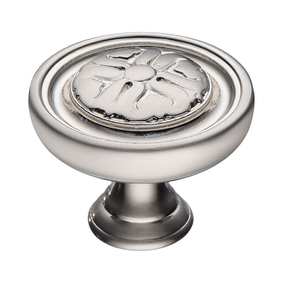 Мебельная ручка стиль классика форма кнопка круглая с орнаментом модель BU 009.35.29 цвет / отделка сатинированный никель материал цамак производство Италия.