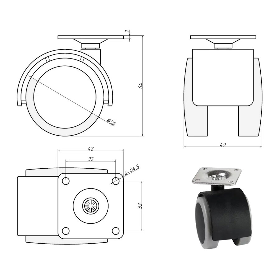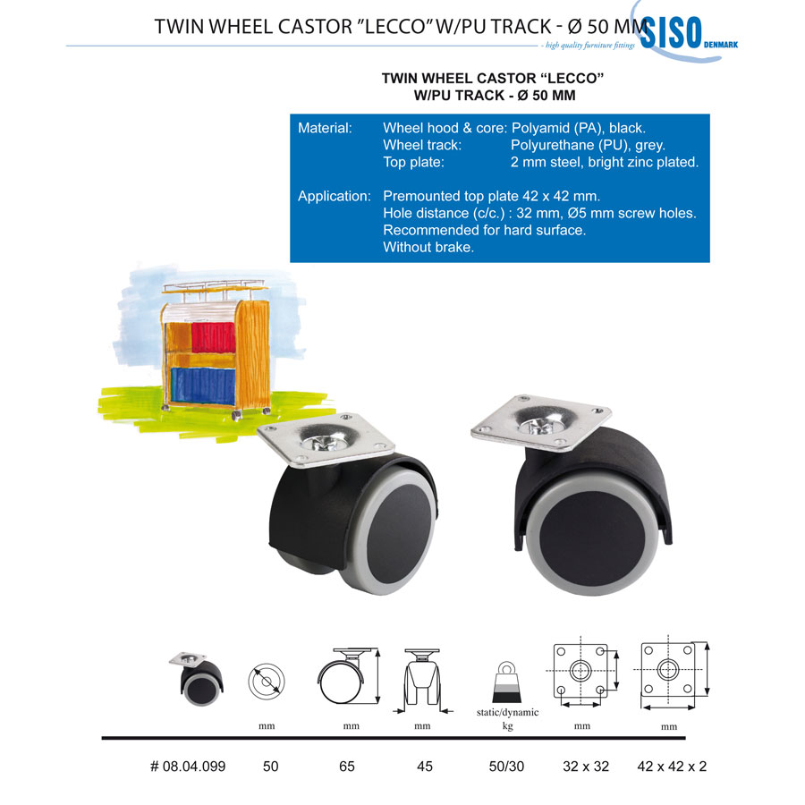 Опора колесико мебельное сдвоенное 08.04.099-1 LECCO цвет черный, серый диаметр 50 мм материал металл, пластик производство Дания.