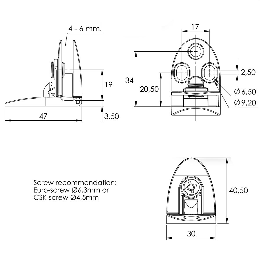 Петля для стеклянной двери "Badge" (верхняя и нижняя части), черная, для встраиваемых дверей, толщина стекла 4-6 мм. 1 винт из сплава Zamak с ПВХ-наконечником, защелка из АБС-пластика.
