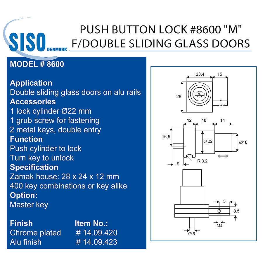 Мебельный замок для стеклянных раздвижных дверей модель 14.09.420-1 цвет отделки/покрытия глянцевый хром материал цамак производство Дания.