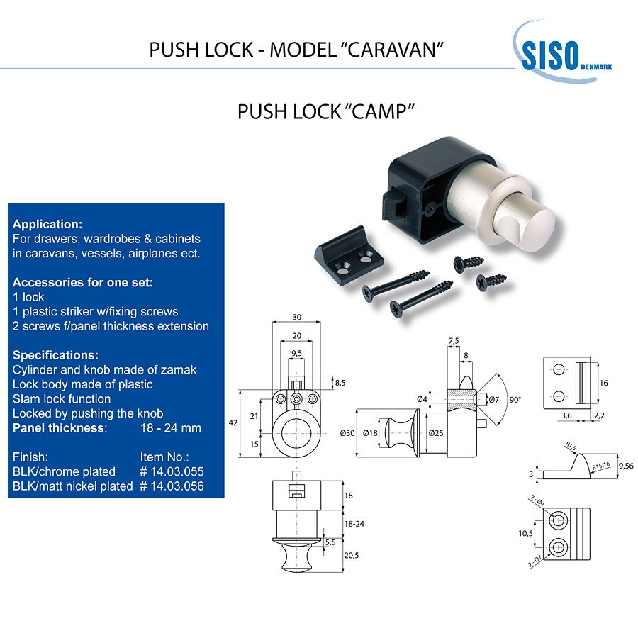 Нажимной замок "CAMP", толщина деревянной панели 18-24 mm, CPL, ручка Zamak & пластиковый корпус - черный, вкл. Пластиковый ударник в черном цвете и крепежные винты, 2 дополнительных винта F/увеличение толщины панели, функция W/Slam.