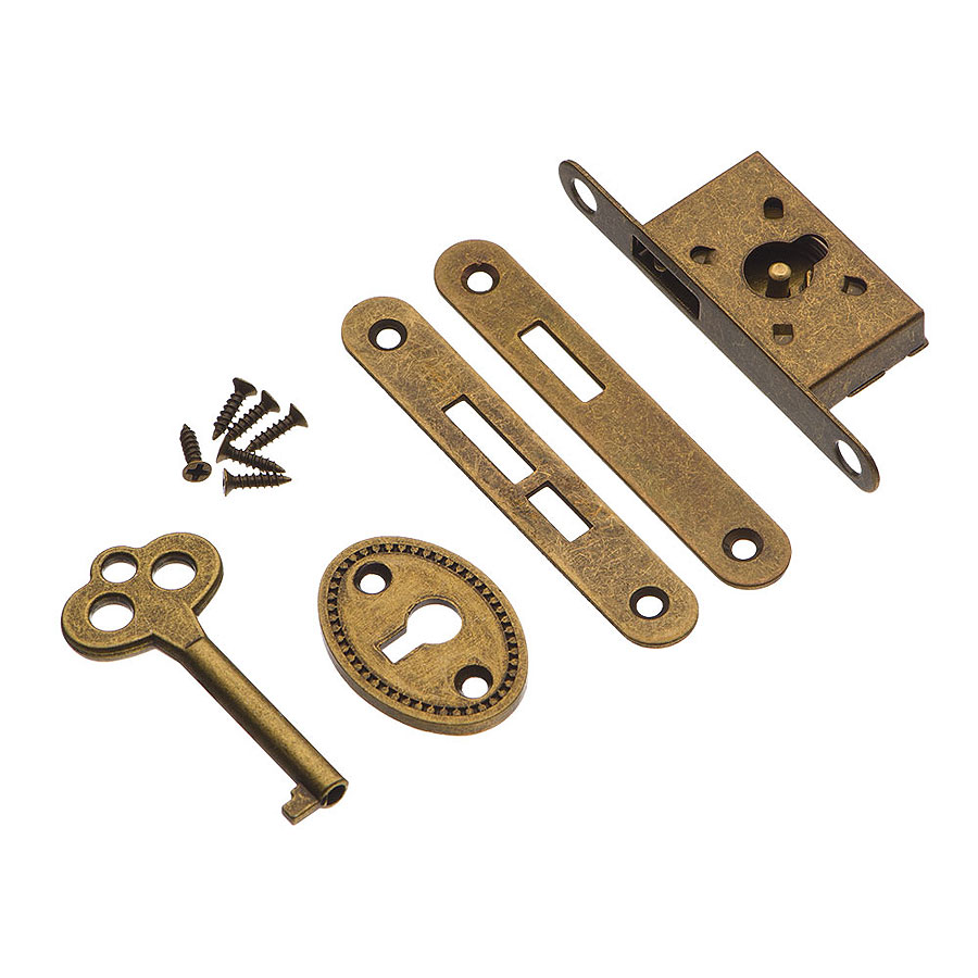 Мебельный врезной замок для ящиков, шкатулок с ключом, накладкой модель 30.00.057-0 цвет отделки/покрытия бронза материал сталь производство Дания.