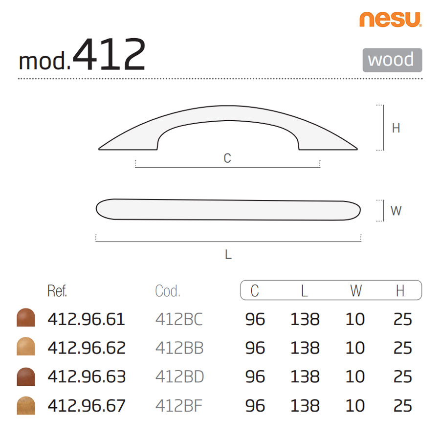 Ручка скоба 412BC дерево длина 138 мм, крепление 96 мм