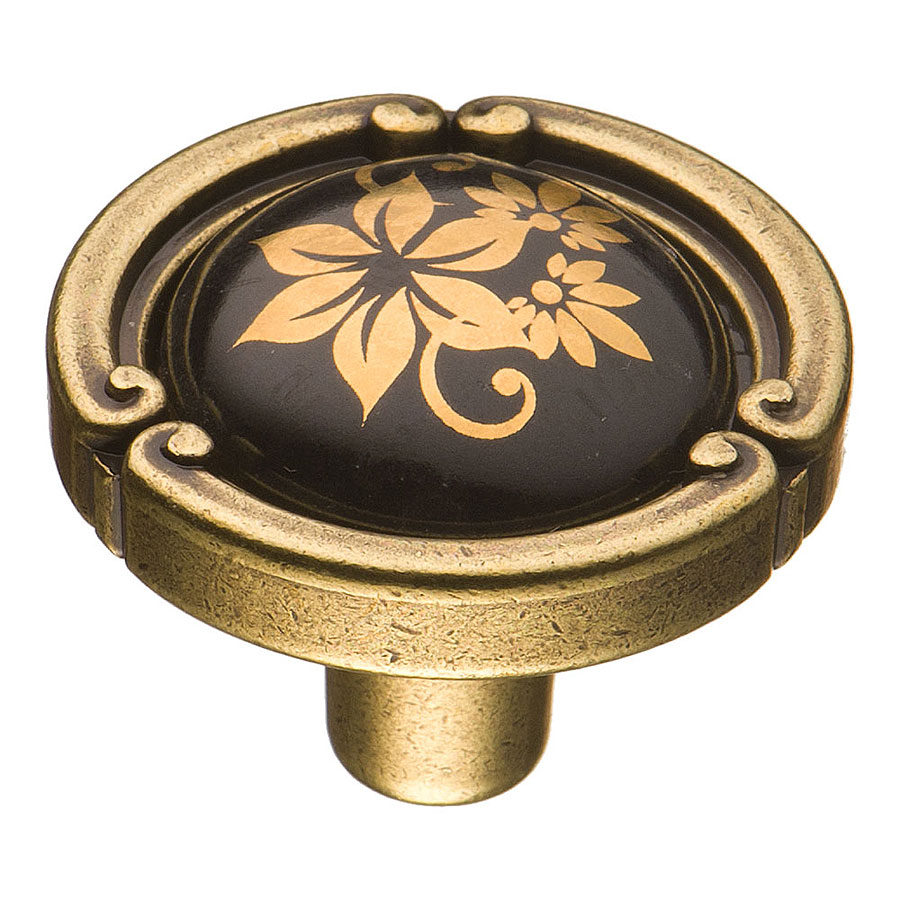 Ручка фарфор кнопка круглая 15.090.35.PO25B.12 античная бронза / черная керамика с рисунком 35 мм