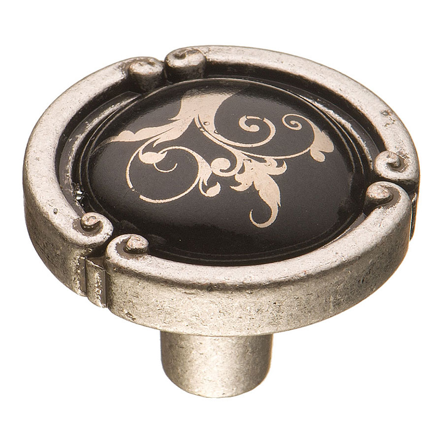 Ручка фарфор кнопка круглая 15.090.35.PO26B.16 античное серебро / черная керамика с рисунком 35 мм
