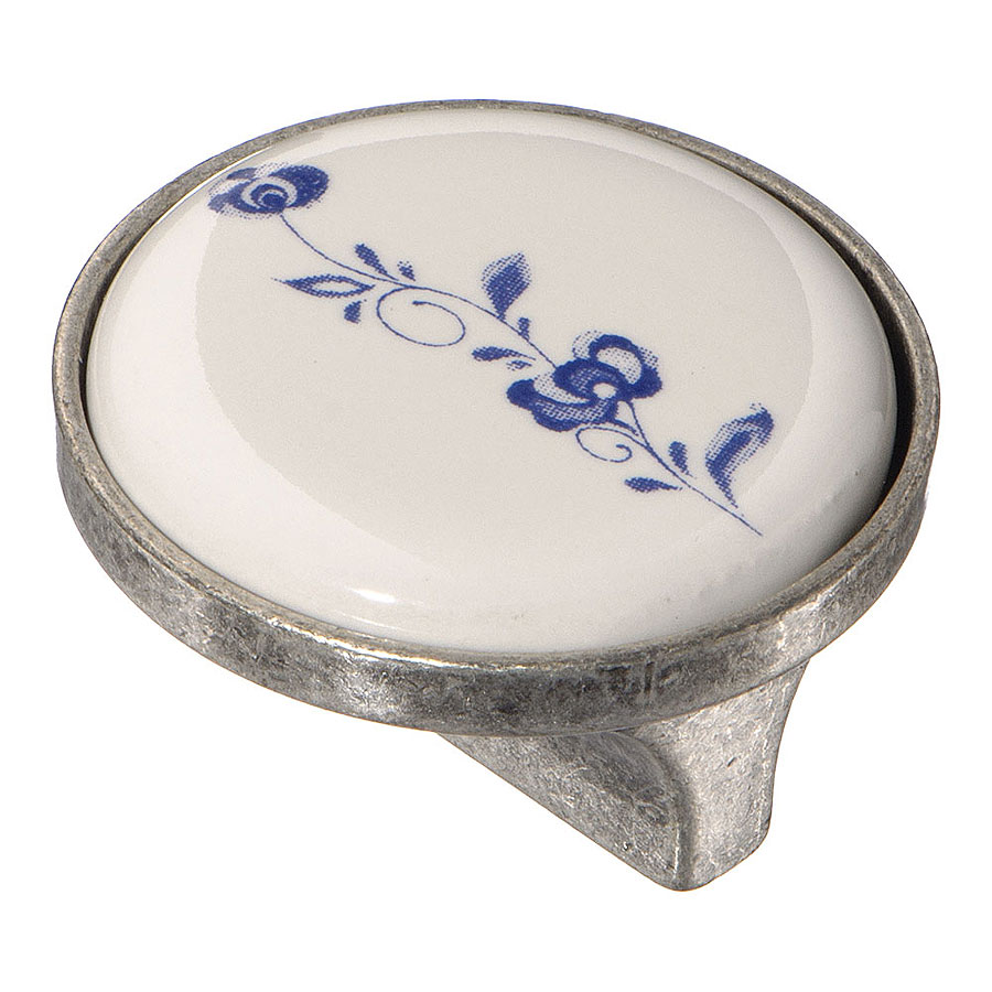 Ручка фарфор кнопка круглая 15.348.32.PO01.16 античное серебро / белая керамика с рисунком 50 мм