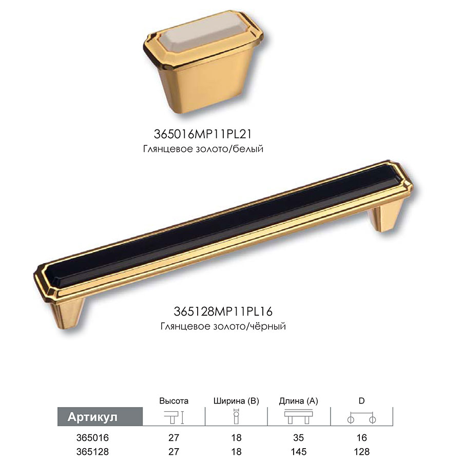 Ручка кнопка 365016MP11PL16 цвет глянцевое золото, черная вставка длина 35 мм, крепление 16 мм