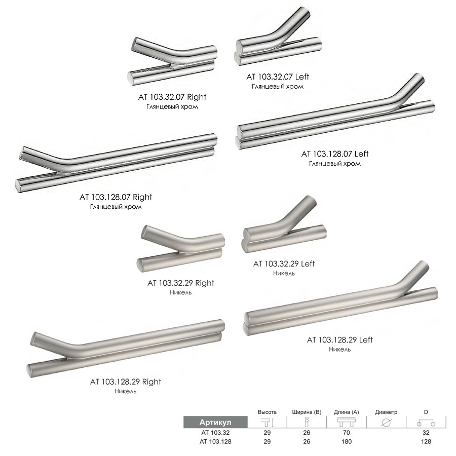 Ручка скоба AT 103.32.07 left ATIPICA цвет глянцевый хром длина 70 мм, крепление 32 мм