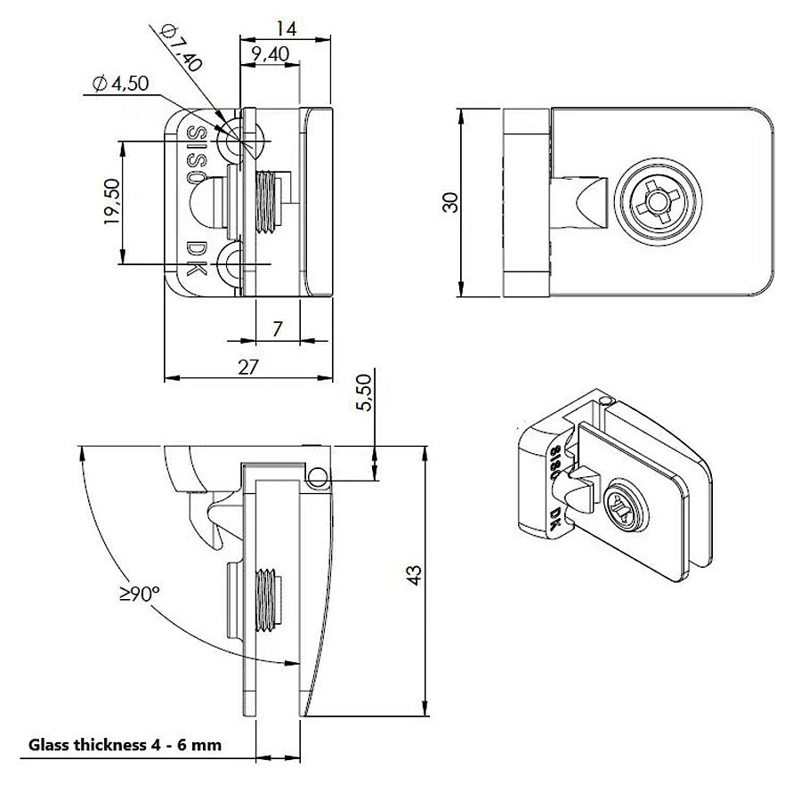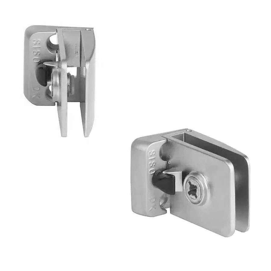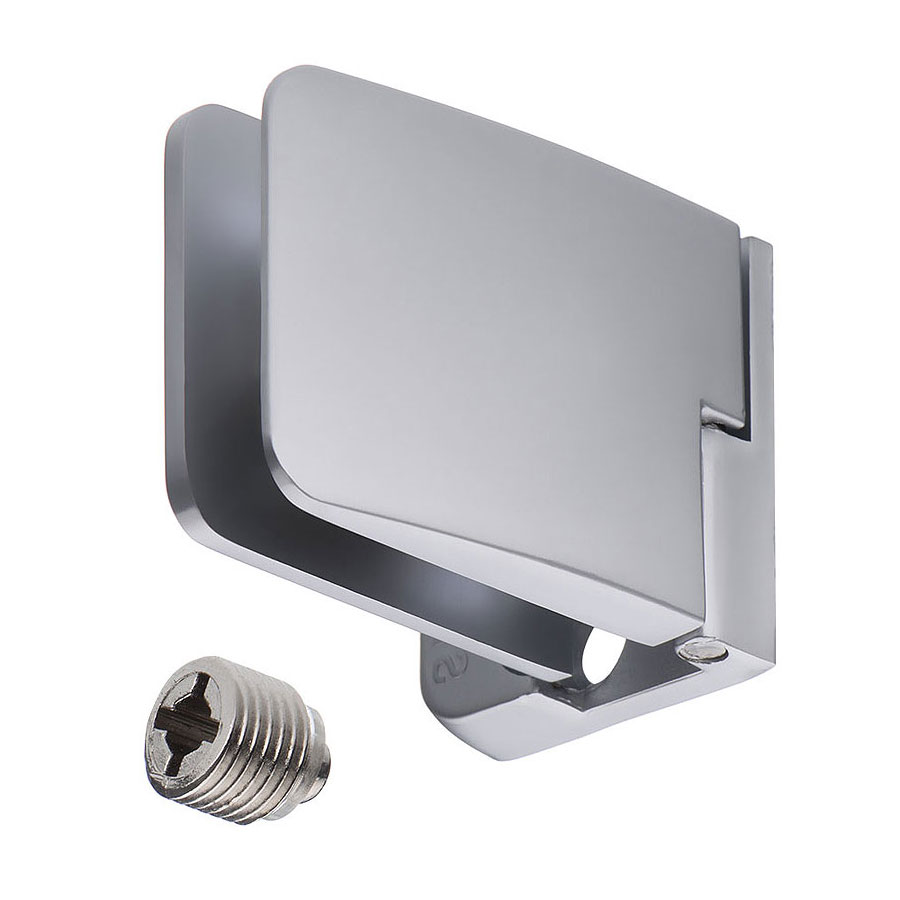 Петля для стеклянной двери "квадратная" с центральным креплением, алюминиевая, для узких рам, с короткой монтажной пластиной, для утопленных дверей, толщина стекла 4-6 мм, 1 саморез из сплава Zamak с ПВХ-наконечником и 1 саморез из сплава Zamak с удлинителем ø5x3,5 мм, защелка из АБС-пластика.