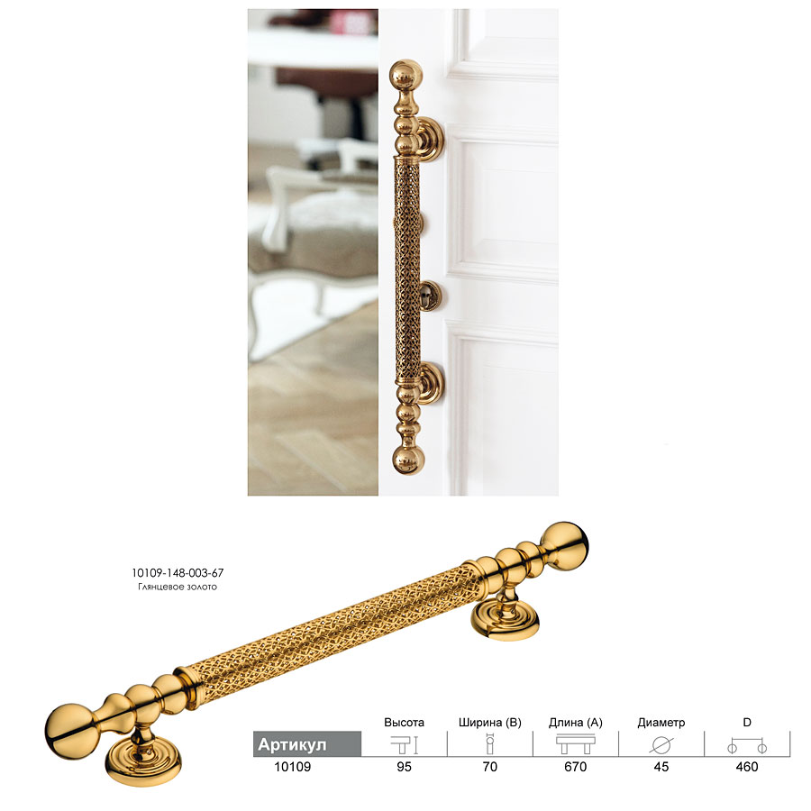 Дверная ручка скоба 10109-148-003-67 цвет глянцевое золото длина 670 мм, крепление 460 мм
