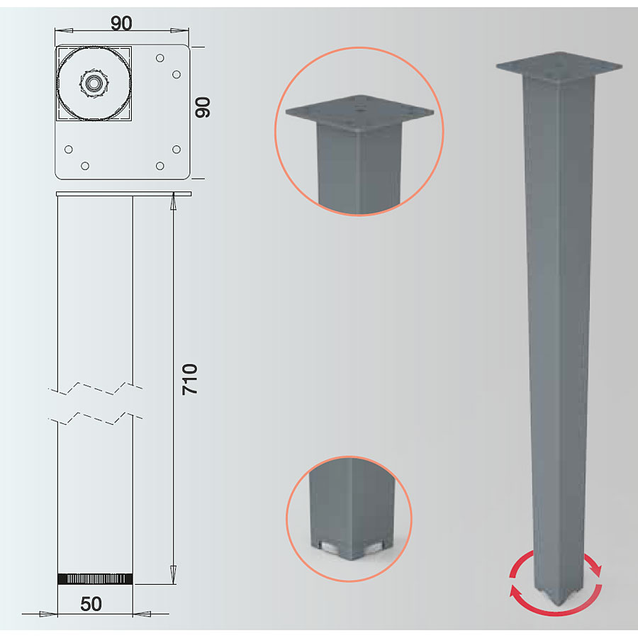 Опора мебельная для стола форма труба квадратная модель KMA-5005-0710-A01 цвет глянцевый хром материал сталь производство Турция.