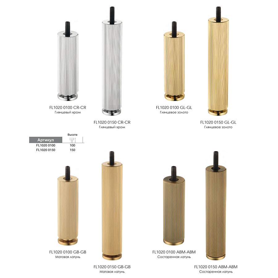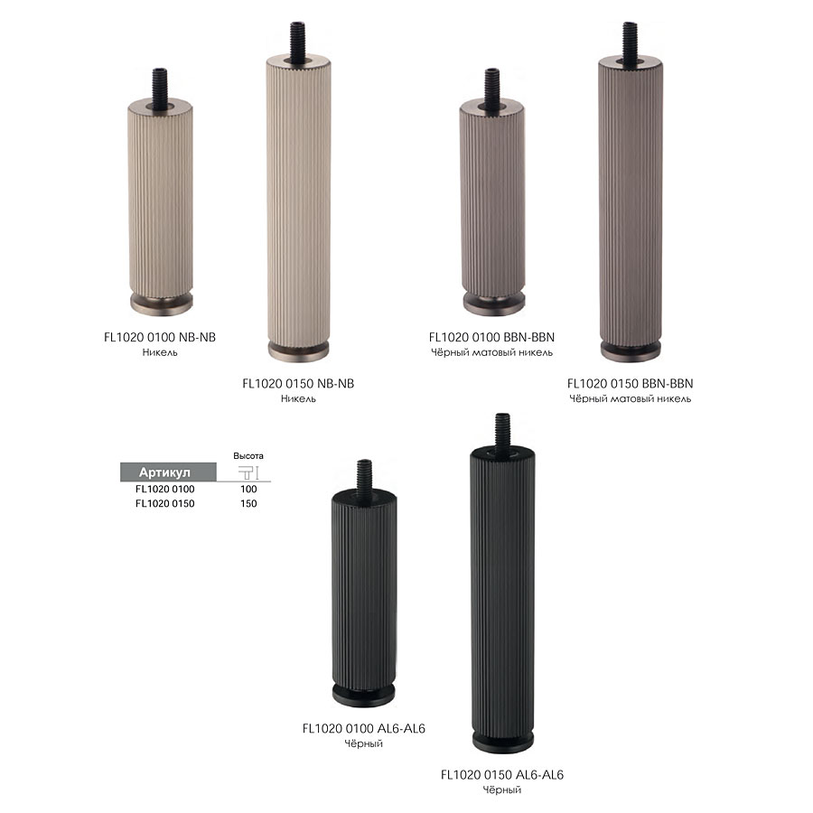 Опора мебельная форма цилиндр с насечкой регулируемая по высоте модель FL1020 0100 NB-NB цвет никель материал алюминий производство Турция.